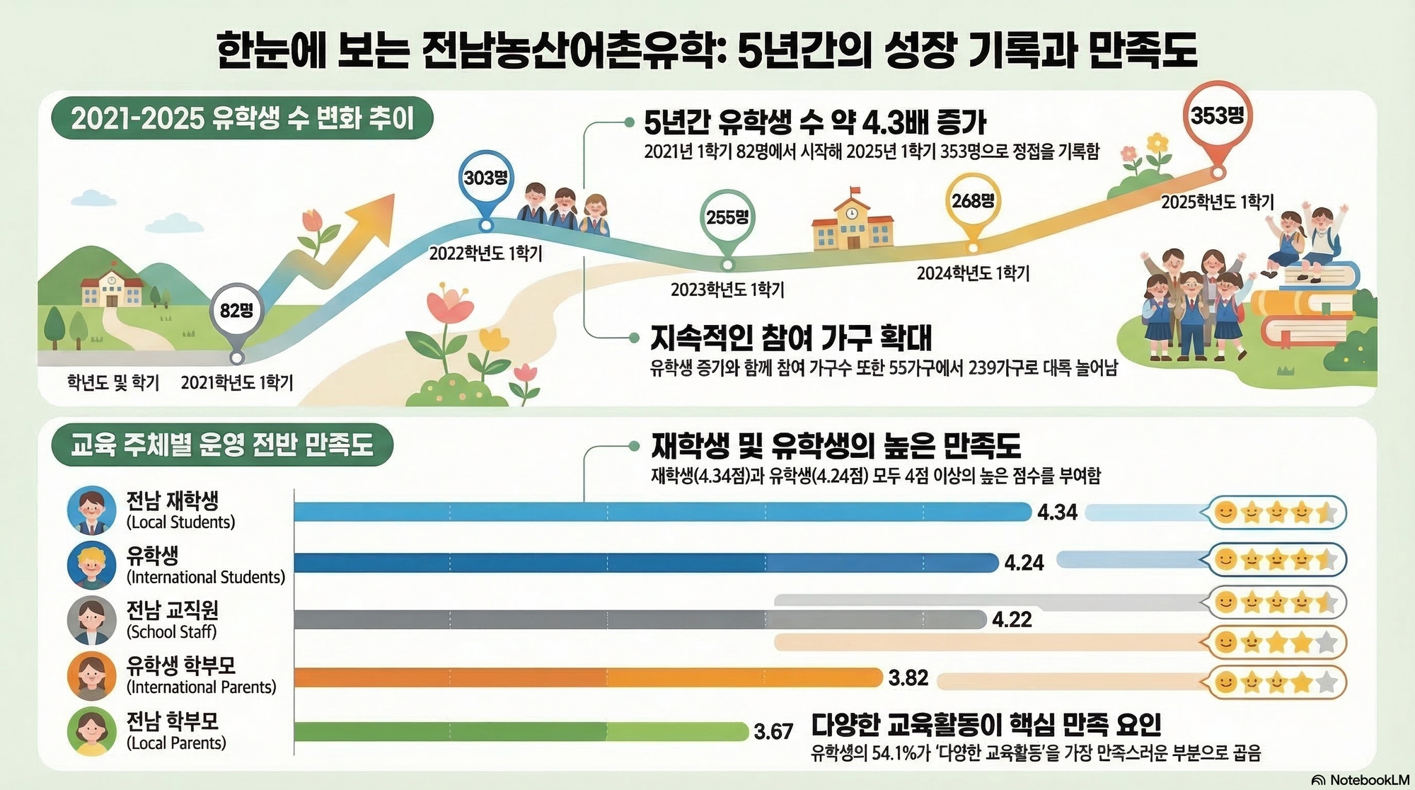 전남농산어촌유학의 성과를 유학생 수의 지속적인 증가와 높은 연장 의사를 통해 입증하고 있습니다. 2021년 1학기 82명으로 시작한 유학생 수는 꾸준히 증가하여 2024년 2학기 341명, 2025년 1학기에는 353명에 도달하며 양적 성장을 이룩했습니다. 참여 가구 수 또한 초기 55가구에서 2025년 239가구로 크게 늘어났으며, 유학 형태는 가족체류형이 90% 이상으로 주를 이루고 있습니다. 특히 2025년 조사에 따르면 유학생 학부모의 86.5%가 유학 연장을 고려하고 있으며, 42.7%는 '반드시 연장하고 싶다'고 응답하는 등 프로그램의 지속 가능성을 정량적으로 보여주고 있습니다.