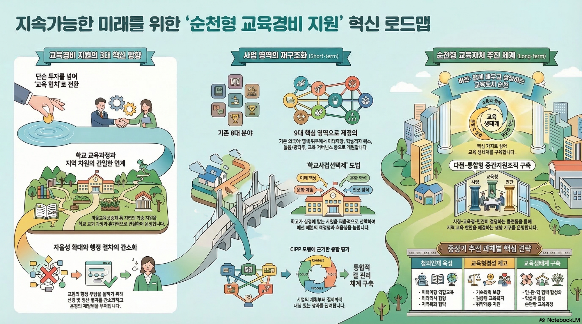 - 정산 절차의 획기적 간소화: 복잡한 신청과 정산 절차를 개선하고 예산 집행의 자율성을 부여하여, 교육경비가 학교 혁신의 동력이 되도록 설계해야 합니다.
