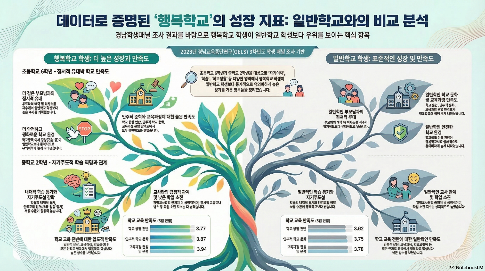 경남교육종단연구(GELS)의 중학교 2학년 패널 데이터를 분석한 결과, 행복학교 학생들은 일반학교 학생들에 비해 내재적 학습 동기가 높고 인지조절전략 등 학습 전략을 더 수준 있게 사용하는 것으로 나타났습니다. 수업 방식에서도 배움중심 수업에 대한 인식과 교사의 피드백 활동, 담임교사와의 관계 등에 대해 더욱 긍정적으로 응답하였습니다,.또한 정서적 측면에서 행복학교 학생들은 일반학교 학생들보다 학업 소진(정서적 고갈, 냉소 등)을 덜 느끼는 것으로 조사되었습니다. 전반적인 학교 교육 만족도 항목(학교 운영, 민주적 문화, 교육과정, 공동체) 모두에서 행복학교 학생들의 만족도가 일반학교 학생들보다 통계적으로 유의하게 높다는 점이 확인되었습니다.