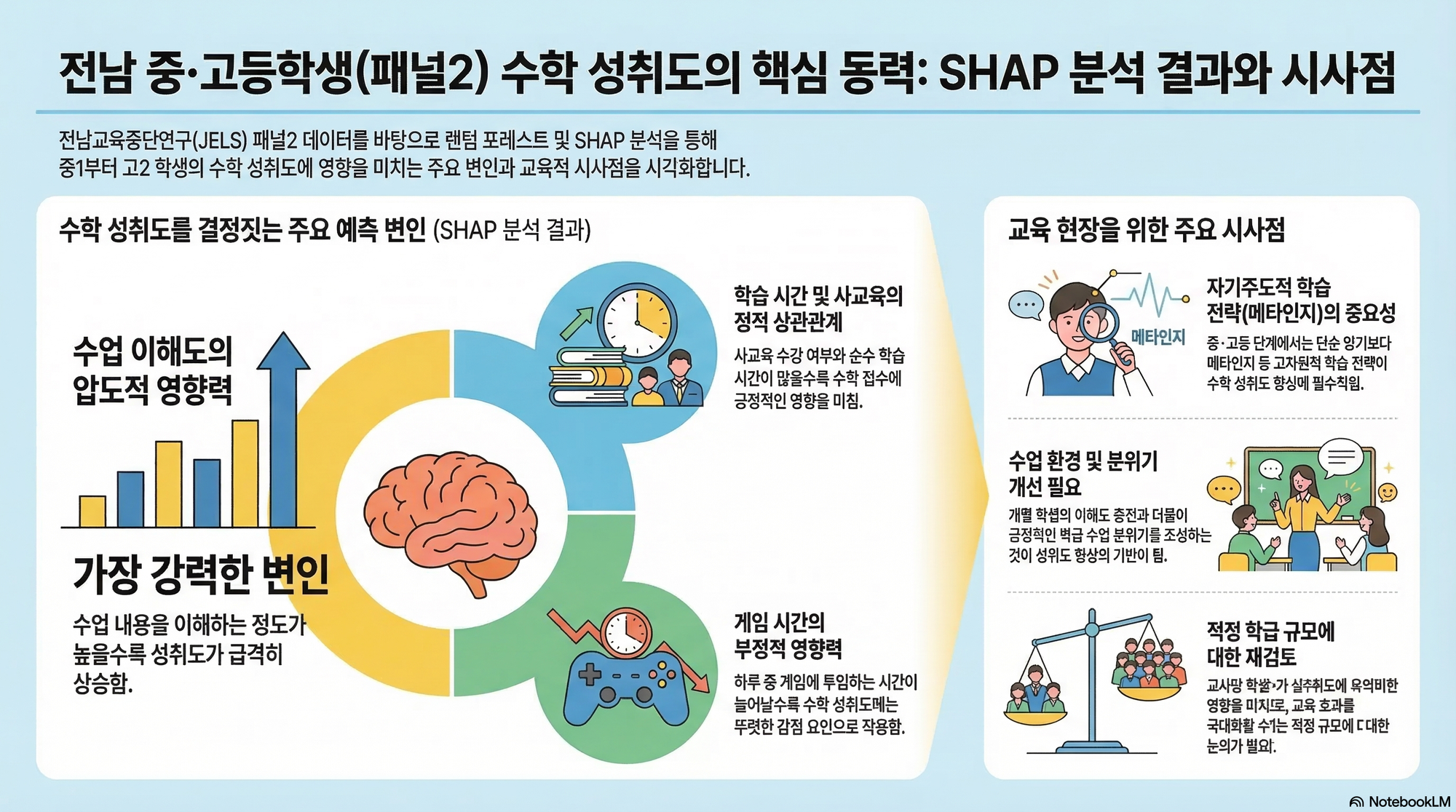 이 연구는 전남교육종단연구(JELS) 1~6차년도 데이터를 활용하여 초등학교 4학년부터 중학교 3학년까지의 패널1(911명)과 중학교 1학년부터 고등학교 2학년까지의 패널2(1,138명) 자료를 분석 대상으로 삼았습니다. 분석의 종속변인은 국어, 수학, 사회, 과학 교과의 성취도이며, 예측변인으로는 학생 및 학부모 설문, 학교 기본 정보 등 약 30여 개의 변수를 투입하였습니다. 분석 도구로는 파이썬(Python)의 랜덤 포레스트(RandomForestRegressor) 모델을 활용하였으며, 개별 예측값에 대한 변수별 영향력을 정교하게 배분하여 해석하기 위해 SHAP(SHapely Addictive exPlanations) 라이브러리를 사용하였습니다.