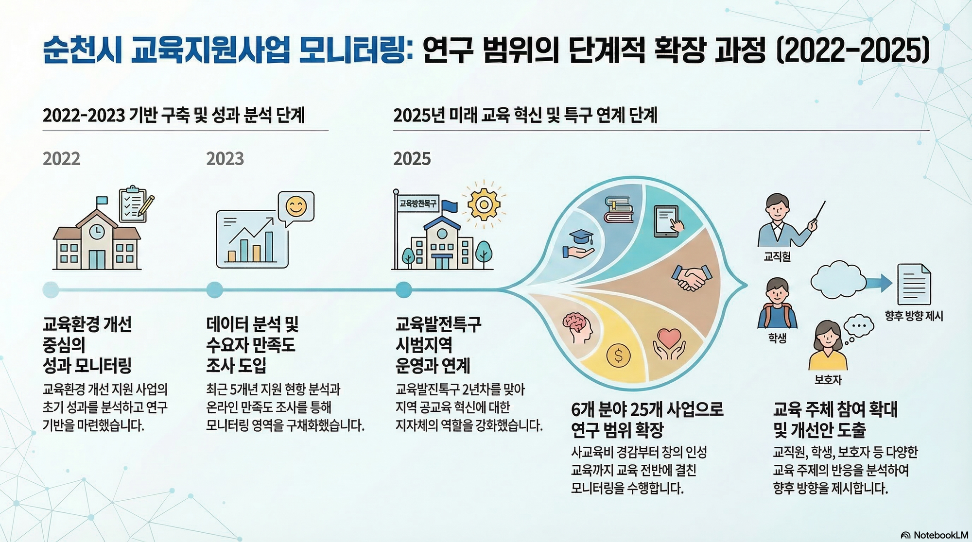 - 연구 범위: 일반 교육경비 지원 사업(24개)뿐만 아니라, 2024년 순천시가 시범지역으로 선정된 '교육발전특구' 지원 사업(12개)에 대한 모니터링이 새롭게 포함되었습니다.